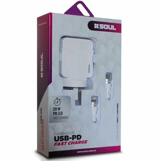 CARGADOR SOUL 220V FAST CHARGE CON CABLE TIPO C A LIGTHNING DUO