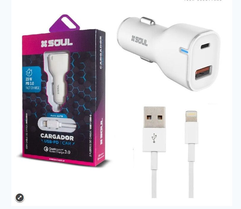 CARGADOR SOUL PARA AUTO 12V USB + C CON CABLE LIGHTNING 20W/PD 3.0